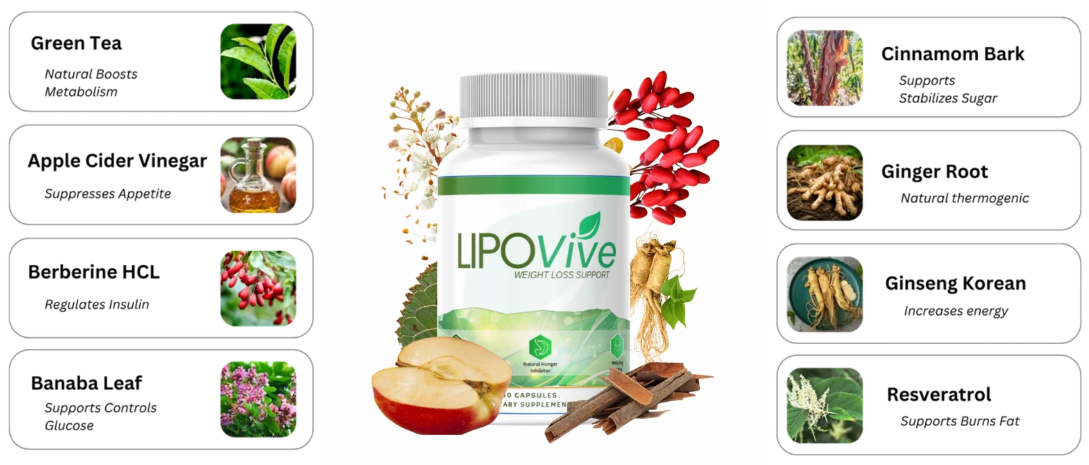 LipoVive contain a blend of natural ingredients that offer various health benefits. Some of the key ingredients include: